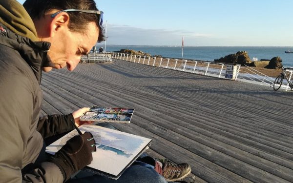 Cyrille Briand. Ce sont des personnes de toutes sortes qui se retrouvent régulièrement pour croquer par leurs dessins ou aquarelles ce qu’elles voient autour d’elles, et qui partagent leurs croquis sur les réseaux sociaux du collectif Urban Sketchers. Il y a la communauté mondiale, des communautés par pays, dont la France, et de nombreux groupes locaux. Il n’y avait pas encore de groupe sur Saint-Nazaire et la Presqu’île, nous étions donc en lien avec celui de Nantes. Il y a beaucoup de gens qui aiment dessiner dans le coin, et j’ai eu envie de les rassembler en ouvrant ce nouveau groupe de proximité Saint-Nazaire – Presqu’île guérandaise. Ce qui ne nous empêche pas de continuer à échanger et à nous retrouver avec ceux de Nantes, c’est très informel tout ça, porté par l’envie.