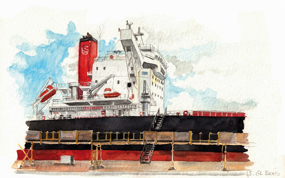 Je dessine partout, mais comme j’habite près de la plage de Bonne-Source, je crois que je l’ai dessinée et peinte sous tous les angles et toutes les lumières. J’ai aussi une affection particulière pour les bateaux et j’en vois beaucoup puisque je travaille au Terminal de vrac du port. En fait, je dessine sur quoi se porte mon regard au quotidien. En 2011, j’ai commencé un carnet de voyage que j’ai appelé “Croquis semaine”* parce que j’y dessine ou peins à l’aquarelle chaque semaine un lieu, une luminosité, un instant. Je suis d’ailleurs en train de finaliser un livre sur l’estuaire, qui regroupe deux ans de dessins.