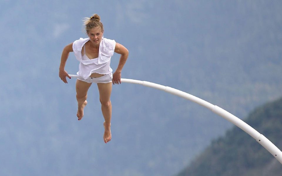 Chloé Moglia, 43 ans, artiste associée aux scènes nationale de l’Essonne, de Saint-Brieuc et aujourd’hui de Saint-Nazaire a su tracer son chemin entre l’art de la suspension, les arts martiaux et le cirque. Elle compose avec légèreté un chemin personnel. Très inspirée par ses lectures, comme celle de l’anthropologue Tim Ingold et sa Brève histoire des lignes elle propose une balade. Pour elle, « les frontières n’existent pas vraiment quand on sillonne les terres et les mers ».